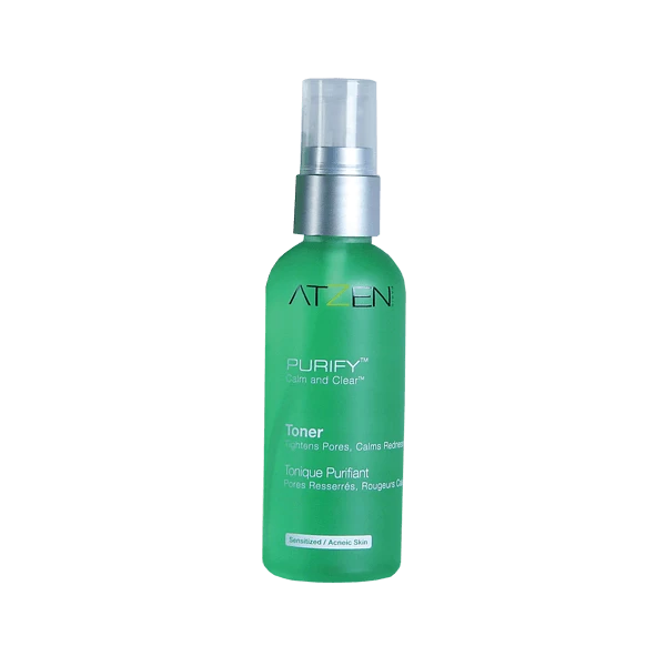 ATZEN Purify: Toner is a 3 in 1 product that transforms acneic skin and optimizes skin’s pH to enhance moisturizers’ and serums’ ability to correct inflamed, oily, sensitive, and toxic conditions; restores disrupted acid mantel (from chemicals in tap water or from harsh cleansers or peels). Use as a face mist through the day: Brings comfort, freshness, and hydration. Sets makeup. Soothing aftershave for men; calms redness. The beautiful color is made of 100% organic leaf and flower extracts.