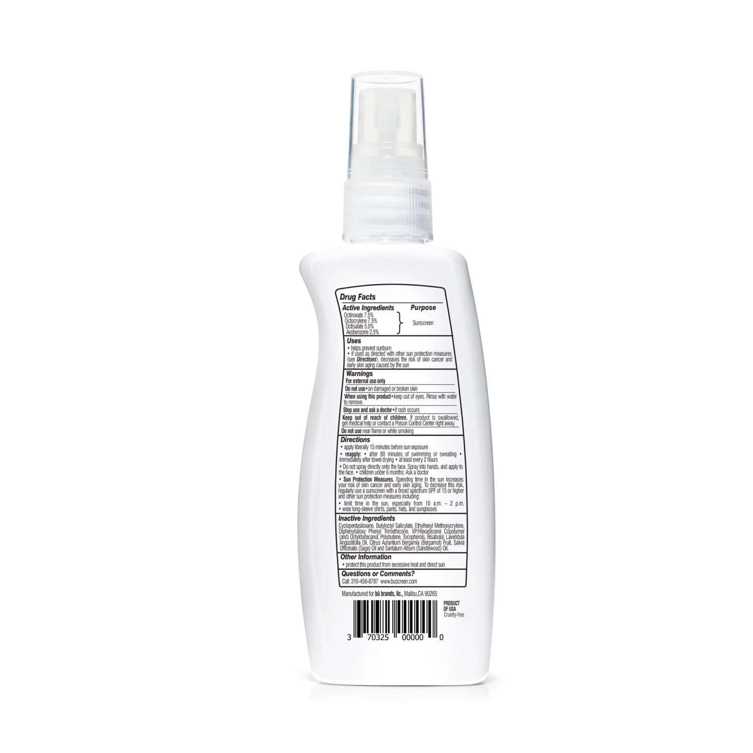 - CONSCIOUS SUNSCREEN – Environmentally-friendly, recyclable bottle & sprayer, biodegradable ingredients, manufactured using solar power. Never tested on animals and 100% vegan. Free of alcohol, PABA, preservatives, oxybenzone and parabens.