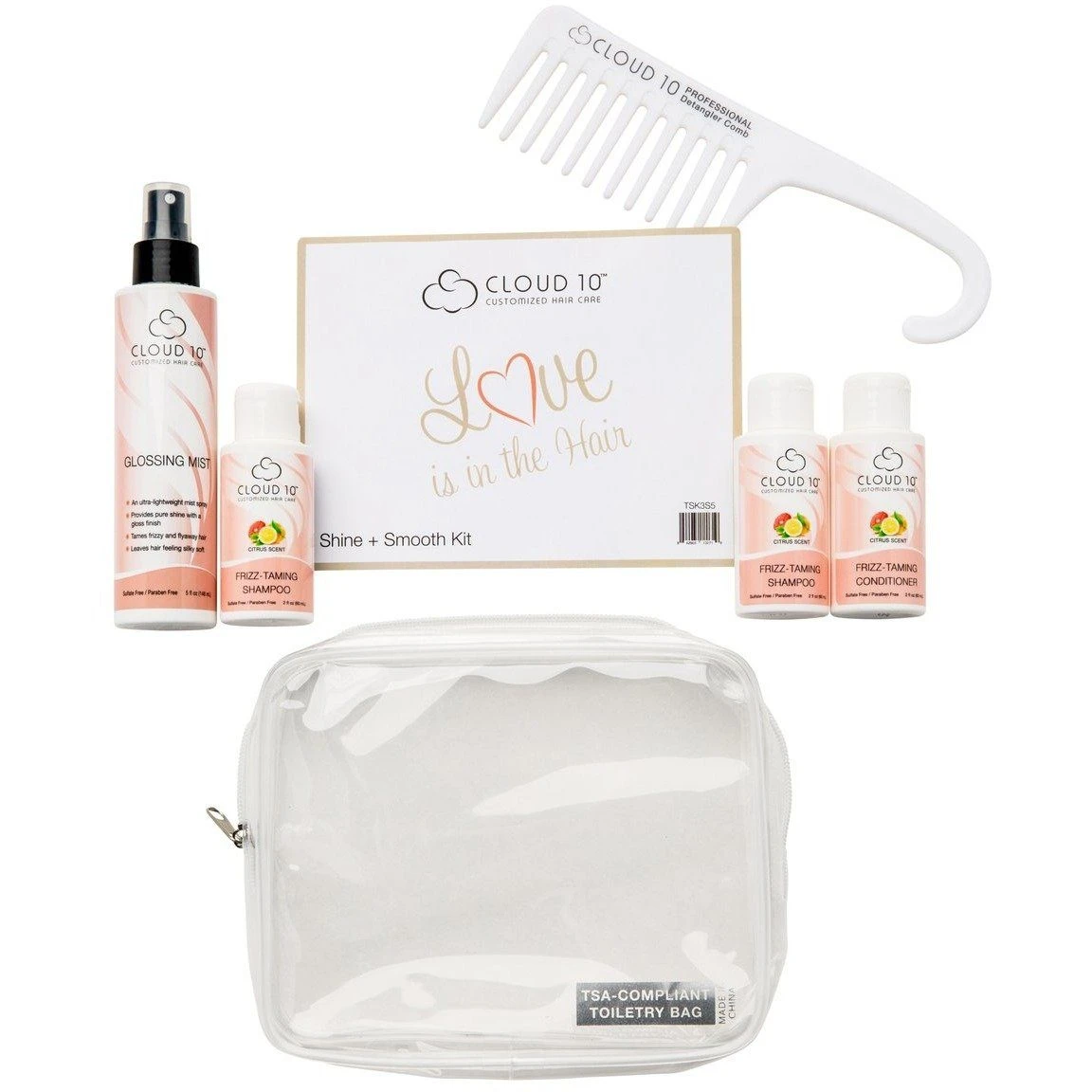Cloud 10 Shine + Smooth Kit includes Glossing Mist (5 oz.), two Frizz-Taming Shampoos (2 oz.) and one Frizz-Taming Conditioner (2 oz.) in Citrus Scent, and a wide-tooth detangler comb, all in a sleek, sturdy, zippered toiletry bag that is TSA compliant.